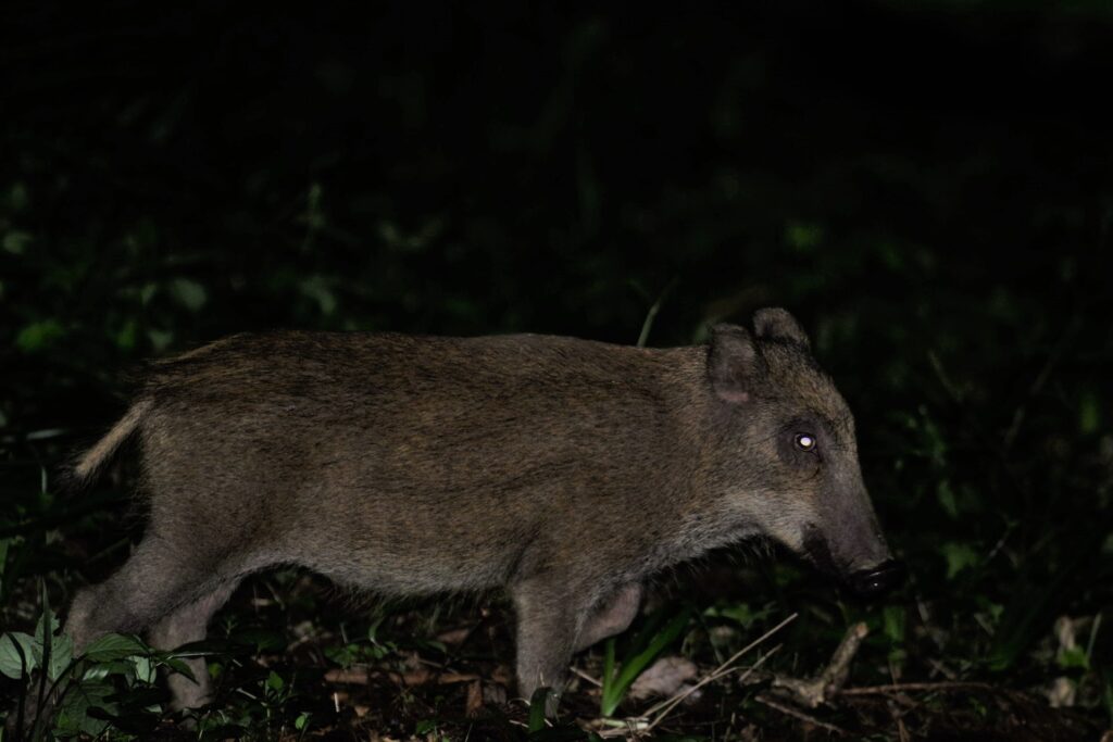 「あっ、イノシシ!」と近づいていくと、いそいそとした様子でこちらを見つめていました。そんなこちらは何とか写真に収めようと一生懸命にシャッターを切りますが・・・新調したフラッシュがうまく動作せず・・・そんなカメラに四苦八苦している自分の姿を見上げるように見ていたイノシシは「なんだ違うのか・・・」といったようにうつむき、背中に哀愁を漂わせながらとぼとぼと去ってゆきました。