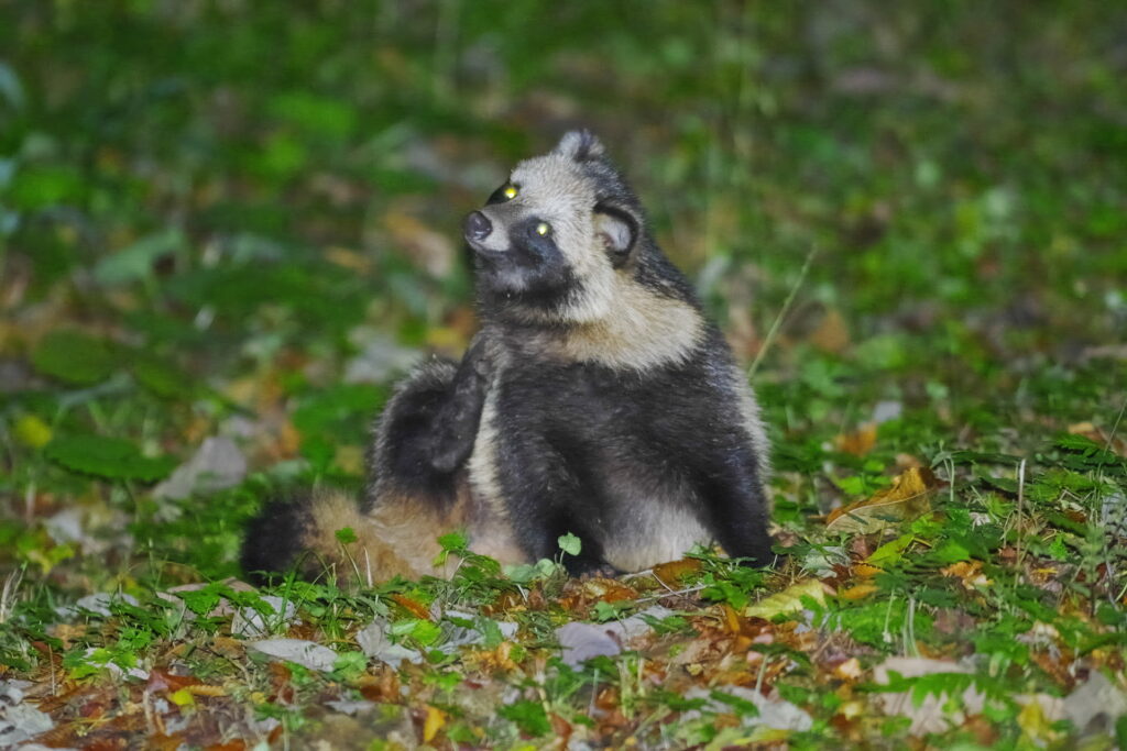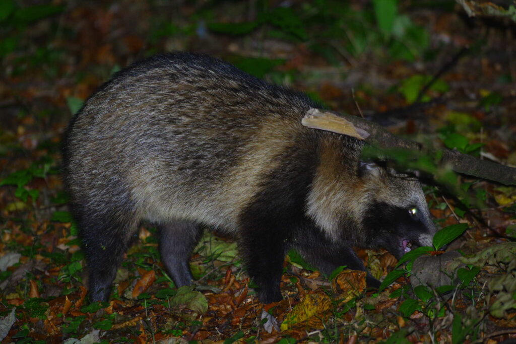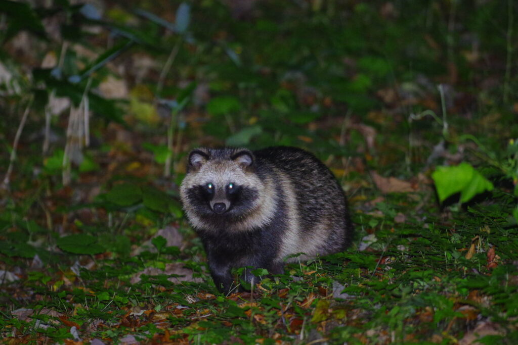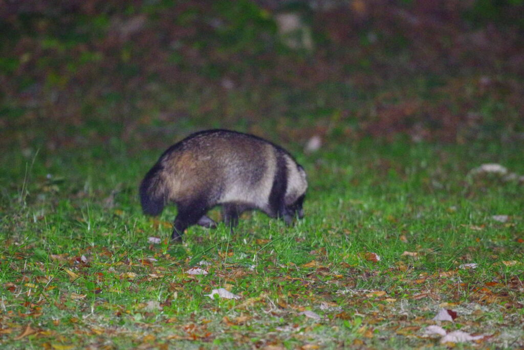 夜の森に入っていると「ガサッ、ガサッ」と笹薮から何かが近づいてくることがあります。忙しいときはかまっていられませんがそうでないときはカメラを手に待っています。何が来るのかわからないので少し緊張しますがたいていは向こうが途中でこちらの存在に気付き、戸惑い、去ってゆくようです。