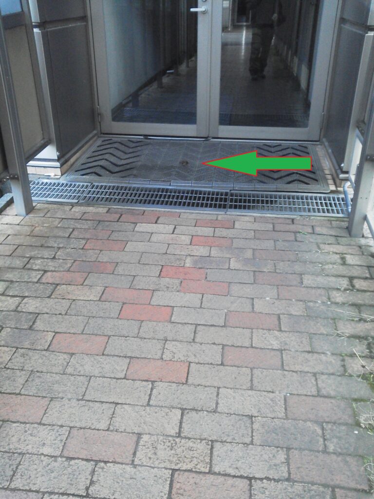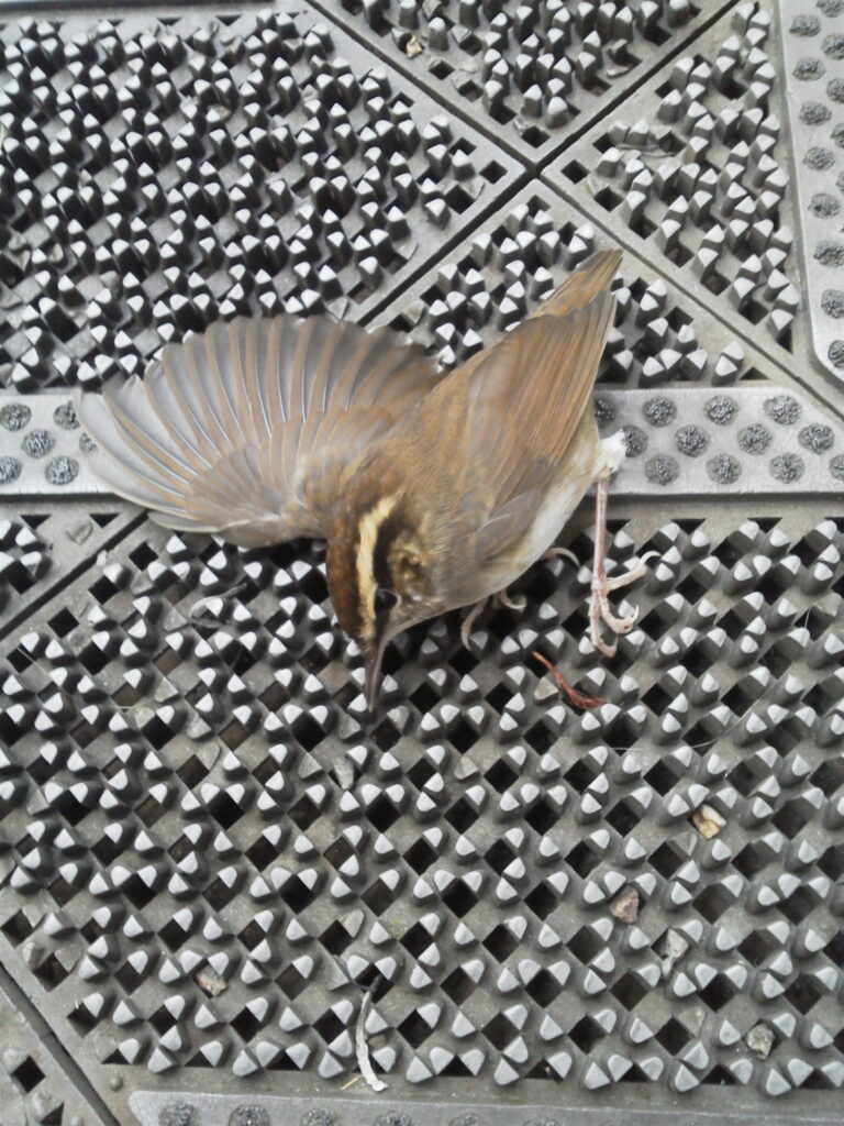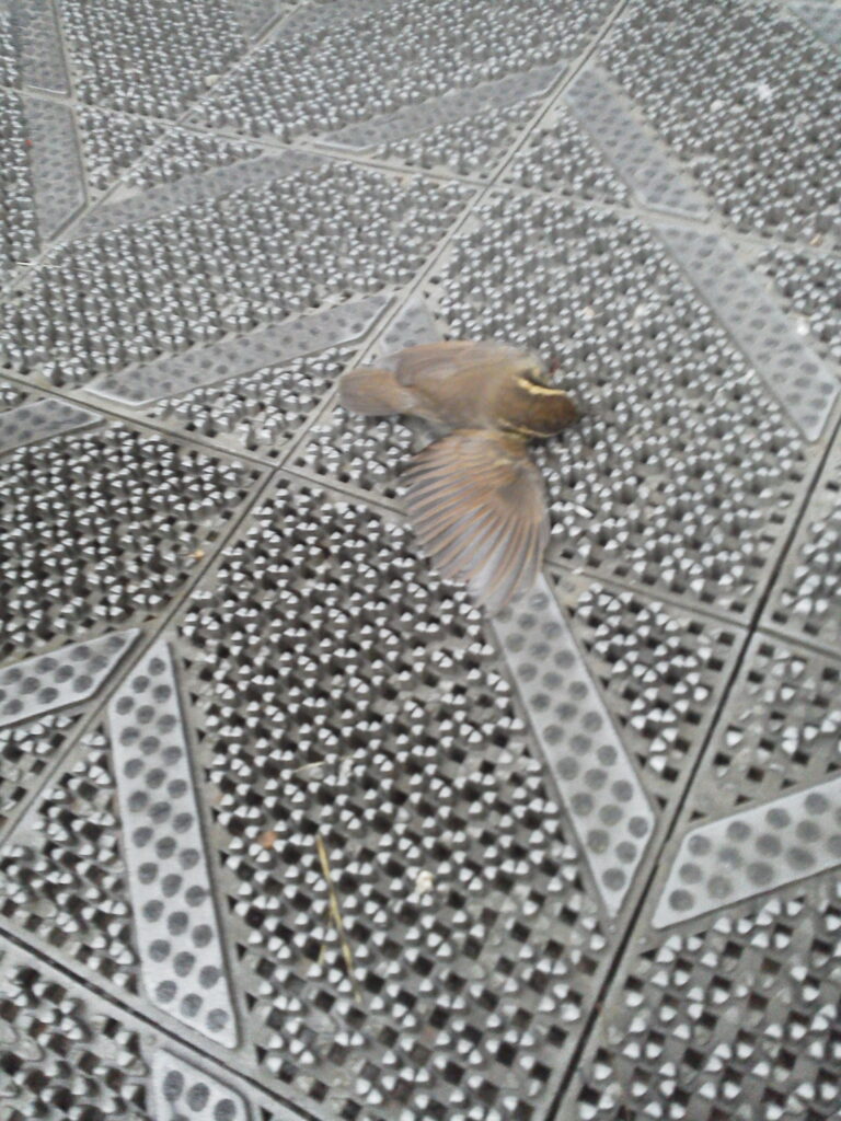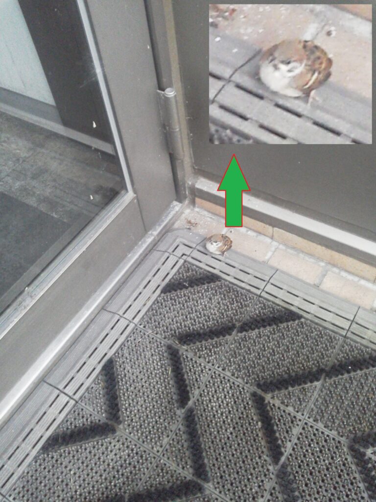 ある出勤時の朝にもドア前の通路で小鳥と遭遇、小鳥は驚いてドアに向かって飛び立ち、勢いよくガラスのドアに衝突しました。よくあることなのであまり気にしていなかったのですが・・