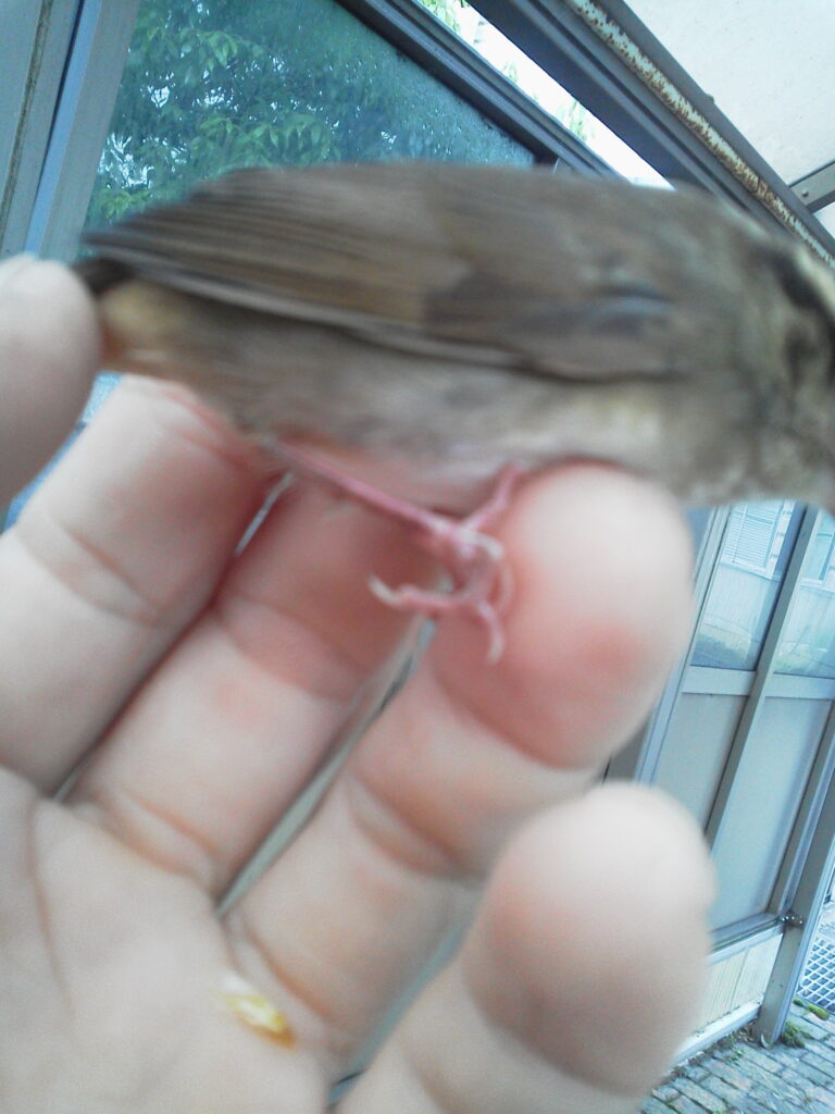 いつもと様子が違います。動かない様子を見て死んでしまったかと思いましたが拾い上げるとまだ生きているようでした。目はしっかり開いていておそらくは意識はあるものの体の自由が利かない脳震盪のような状態だったのではないかと思います。片足は力が入らないようでもう一方の足でなんとか指を掴みました。