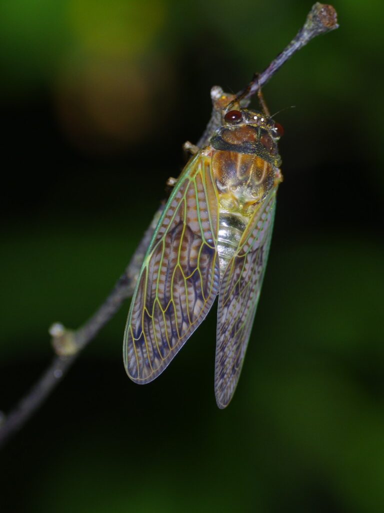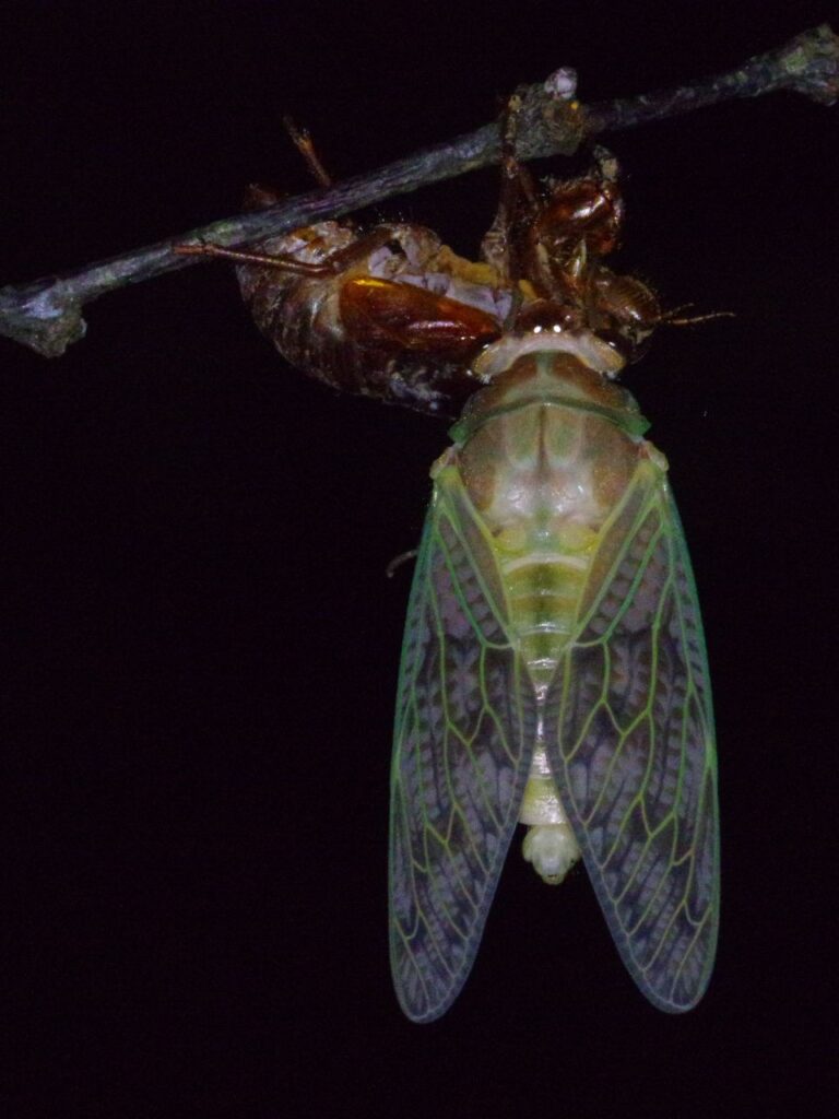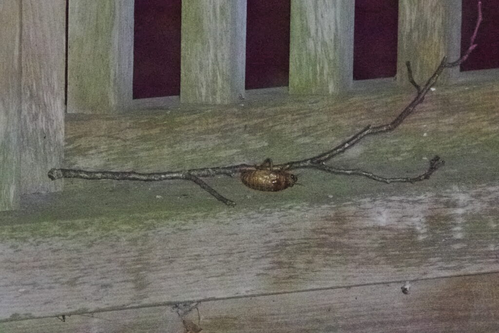 その後、本殿を登っていき羽化をするまで・・・見ているほど気は長くないのでその場を離れます。すると振り返ってすぐの樹の枝に羽化直後?のセミがとまっていました。これは・・・あちこちで羽化をしているのでは・・・と、慌てて探してみたものの他には見つかりませんでした。ここも最後まで見ているほど・・・なのでその場を後にします。2時間ほどして再び見てみるとだいぶ羽が乾いたようです。アブラゼミでしょうか(抜け殻は枝に登る過程で下に落ちたようです)。