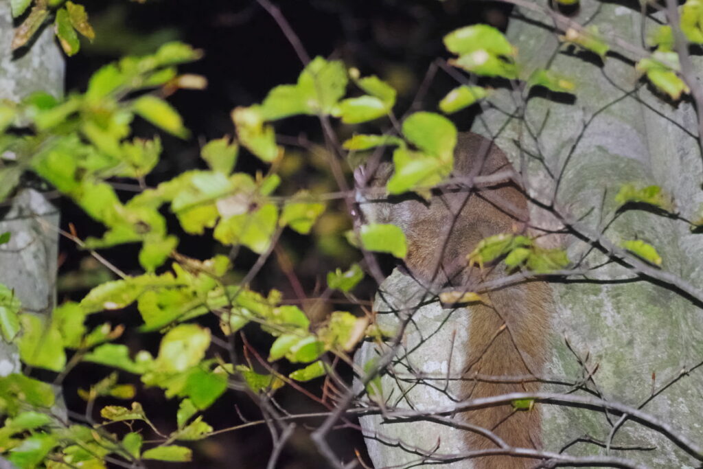 10月下旬、夜の森の中を歩いていてムササビを見つけました。少し遠かったのでもう少し近づこうとしたところ藪で足を踏み外して思いきりずっこけ、バキッバキッバキッという大きな音がしてしまい、ムササビは驚いて近くの樹洞に逃げ込んでしまいました。