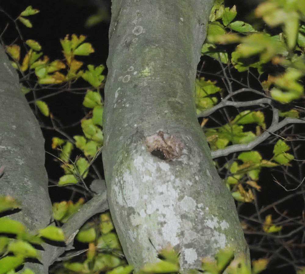 こちらは「あっあんなところに樹洞が!」と思った次第です。ムササビは何度も樹洞から顔を出してこちらの様子を伺っていました。その様子を横目に見つつ、樹洞に向かってどこにカメラをセットしようかと画策していました(実際はとても高く、距離があり、断念しました)。幾度かこちらを確認したのち、あるタイミングで「今だ」とばかりに樹洞から出て一気に駆け上がり奥のほうへ滑空していってしまいました。