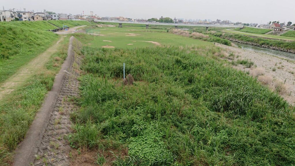 7月13日土曜日、伊丹市の藻川へカヤネズミの巣を探しに行って来ました。曇り空でたまに小雨が降る天候。 土手の上から見るとあまりオギやアシが伸びてない……。昨年の相次ぐ台風・大雨でオギの背丈を越える程の大水になり、河川敷はかなり荒れている感じです。ゆっくり歩きながら探し始めましたが、なかなか見つからず心配になってきました。