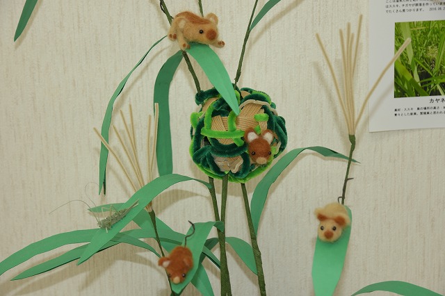 文化祭の前日に作品を展示にいったのですが、同じく展示に来ていた地元のおばあちゃんたちがカヤネズミをかわいいとみんな集まってくれました。カヤネズミ幼獣の写真にも文化祭の期間中を含めて反響があったようです。身近にこんな動物がいることに驚かれていました。私はずっと米作りをしてこられたおばあちゃんたちがカヤネズミの存在を知らないこと、草バッタの作り方を知らないことに驚きました。同じ地域といっても地区毎に山があって7つの地区に分かれていて、自分の住んでいる地区以外の人とは文化祭や夏の花火大会の時ぐらいしか交流できません。私の地区で米作りをしている方の中には、名前を知らなくても機械で稲刈りをしていると最後に出てくるネズミということで、存在を知っている方はいます。また、カヤネズミの保護活動をしているというと、「カヤネズミってなに?」と興味を持ってくれる方も増えてきました。