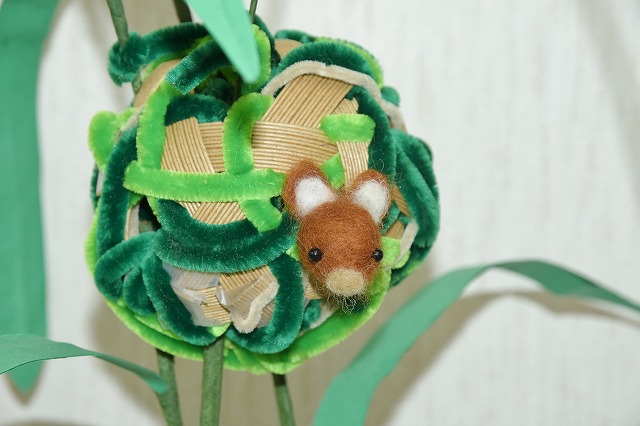 ススキ株のカヤ巣とカヤネズミ親子です。チガヤで作ったバッタがわかりますか?カヤネズミは自己流ですが、羊毛フェルトで作りました。本物を見たことがなく、写真を見てもよくわからないし、結局、桂川でいただいた缶バッジの幼獣を参考にして作りました。幼獣を参考にしたのに一番大きなカヤネズミになったので、親ということに。同色の羊毛があまりなかったので、それぞれ個性的なカヤネズミ親子になりました。(本物はもうちょっと耳が小さいです)