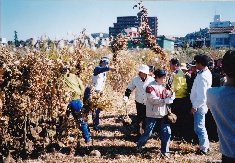 この土地に、私が会長を務める、「坪井川流域八景(はけの)水谷(みや)研究会」で植樹会を開催するようになったのは、平成8年からです。「昆虫の集まるクヌギ林と、ヤナギの揺れる水辺にそだてよう!」という呼びかけに応じて、約600名の参加(子供から大人まで)で、クヌギ、ヤナギ、ネズミモチなどを植樹。それぞれ、子供の成長記念だったり、家族の思い出つくりだったりで、楽しいイベントになりました。その後も毎日散歩を兼ねて、自分たちの植えた木の成長具合を確かめに訪れたり、水をやりに通ったりと、愛着を持って育ててくれました。