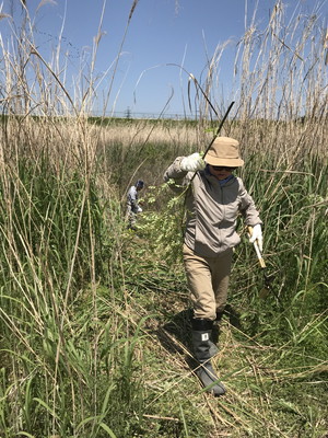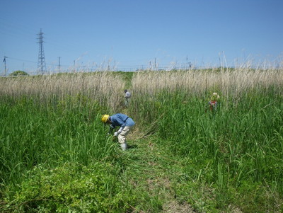 4月29日(日)に第1回「カヤネズミのすむカヤ原保全プロジェクト in  2018」を開催しました。オオヨシキリやウグイスの声に時々耳を傾けながら、観察路を作り、カヤ原に増え始めたイタチハギやノイバラを、ノコギリや鎌、枝切りばさみなどを使って除去しました。終了後は、桂川で撮影したカヤネズミの動画を見ながら、冷たい飲み物でお茶会を楽しみました。