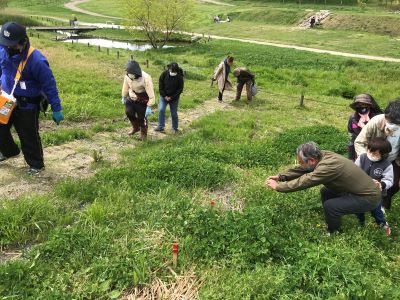 1カ所目の活動場所に到着。冬のあいだに移植したオギの新芽を観察しました