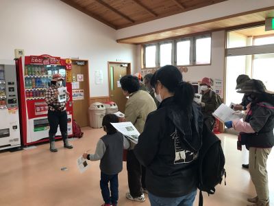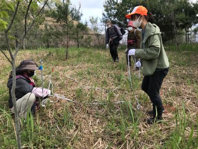 | 最初にカヤネズミの生態やごりごりの丘でのこれまでの活動についてお話を聞きます。 | 2カ所目の活動場所では、グループに分かれて植生調査のコドラート(方形区)づくり。オギの草丈や被度を記録します。 |