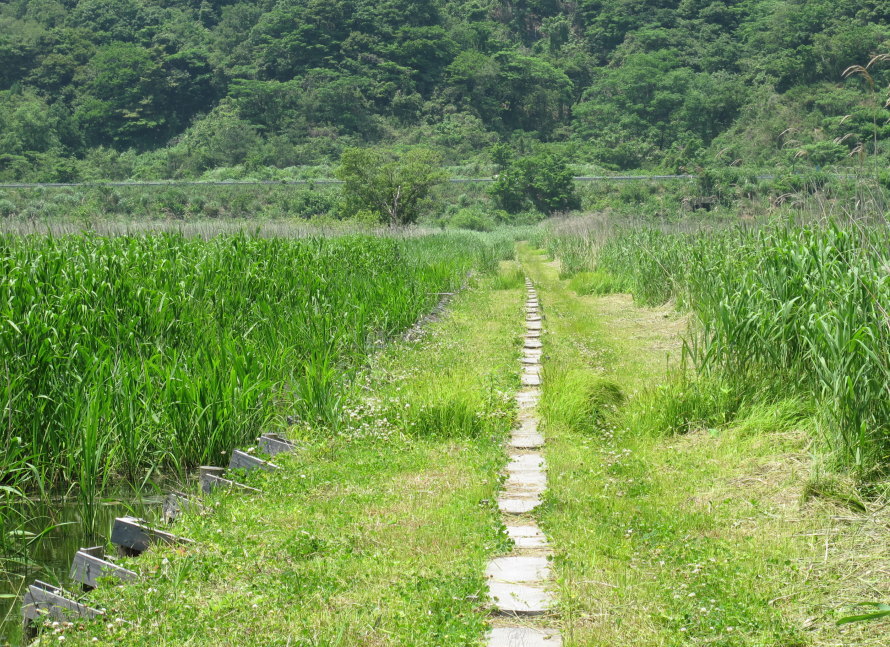 さっそく、おじちゃんたちにカヤネズミの生活や行動などと合わせて、そのアドバイスを伝えてみました。「わかったで~、ええもんにしとくわ~」と二つ返事。てっきり、ややこしい、とか、残すとこマーキングしとけよ~とか、言われるかと思っていたので、ちょっとびっくり(笑)そして、草刈り後に見に行って二度びっくり。水路沿いの数か所で、ヨシ原から、幅数十センチのスゲなどの低い草の道が、散策路を横切り水路脇のヨシやマコモまでつながり、そしてそれらの高い草が水路の向こう岸の高い草へと渡る天然の草の橋となっていたのです。ちっちゃなカヤネズミの動きをイメージしながら、もしかしたら結構面白がって(笑)、この草の道を残してくれたんじゃないかなぁ、なんて、おじちゃんたちのその様子や心持ちを想像すると、なんとも優しくほのぼの~としました。