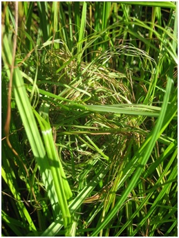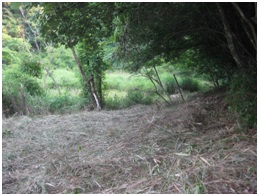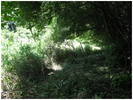 このような過酷な環境に、私が調査しているカヤネズミたちは生息しています。前任の滑川喜生氏が2010年(平成22年)に調査を始められて4年目、私自身は2年目になります。昨年は巣の数が少し増えたのですが、今年になって頭が痛いのが、調査中のイノシシとの遭遇です。耕作放棄地周辺はヒトの手が入らないために、竹林が広がり、そこにからまるヤマイモなどのマント構造が、イノシシの絶好の隠れ家・エサ場となっていました(図2)。5月の約1か月で暇を見つけて、竹林の刈取りを行いました。カヤネズミのすみかの可能性も考えられたため、機械は使わずに、鎌1本で少しずつ刈り取っていきました(図3)。今年は例年より遅い7月8日に作りかけ?の巣(図4)を初めて見ることができました。
