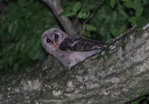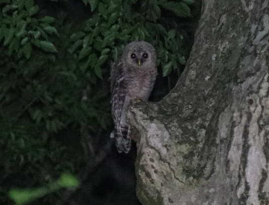 樹上性の生き物だろうというのはわかりましたが何なのかさっぱり見当がつきませんでした。その鳴き声の主は若いフクロウのようでした。ギャアギャアという鳴き声の前や合間に聞こえてきた大人のフクロウの鳴き声は親のものかもしれません。