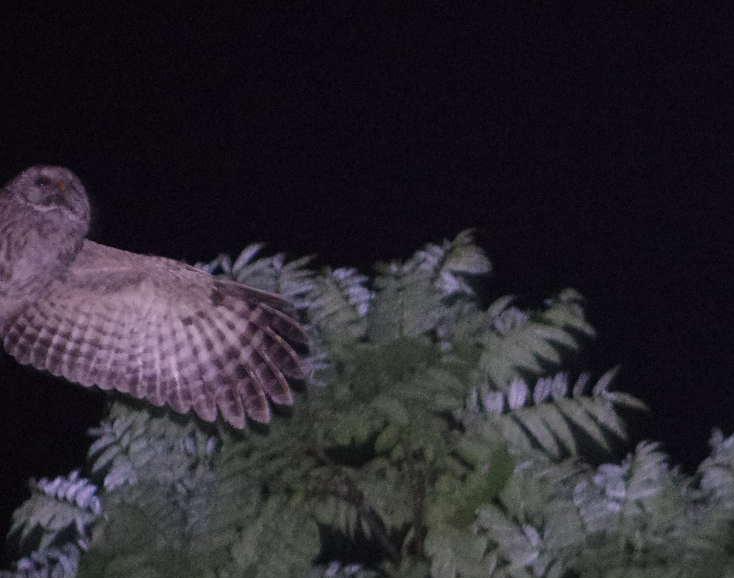 あっ、フクロウだっ!カメラを用意しようとしますがすぐにフクロウはこちらに向かって飛び立ちました。カメラを構えるのは間に合いません。フクロウは私の頭上をかすめるように飛んでいきました。一応流し撮りしましたが確認すると残念な写真ばかりです・・・。唯一、端に半分だけ写ったものがありました。トリミングしているので実際は本当に端っこです。