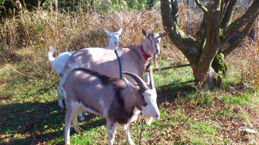 そんなわけで2014年初夏、二頭の子ヤギを迎え入れた。有毒植物を調べたりマムシを追い払ったり、慎重に慎重を重ねているうちに、メスヤギが妊娠出産したりして延び延びになり、本格的なフィールドへの放牧は2015年春からとなった。