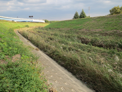 今回巣1個を見つけたところは、河床の少し高いところにあるヨシで、倒されずに残ってました。前記のオギの群落は少し高い位置なので、増水で倒されなかったのですが、クズやヤブカラシなどに覆われていて営巣は無理です。また行政の堤法面の草刈は今年も1ヶ月前に行われましたが、刈られる前に見つけていた巣は当然なくなってます。今後1ヶ月は子育てシーズンなので、散歩しながら、無理とは思いますが、巣が作られるかどうか見守ります。なお、桂川でのオギ原の回復実験の区域は高水域なので、増水で根元が50cm程浸かりましたが、オギは安泰でした。