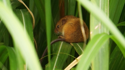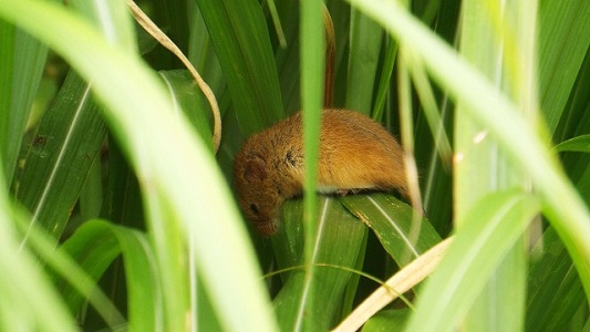 梅雨の晴れ間の7月2日、てんたの会で毎年行っているカヤネズミ調査(モニ1000里地調査)での出来事です。8人で調査したにもかかわらず発見した巣はたった1ケ。でもススキの株の中で動きまわるカヤネズミを発見、皆で見ることができました。小さな谷戸の一角でかろうじて生命の糸をつないでいる天覧入りのカヤネズミは、昼間でも良く目にすることができます。狭いススキ原には人が立ち入ることが多く、人馴れしていることと逃げ場がないことが幸い(カヤネズミにとっては災い)していると思われます。