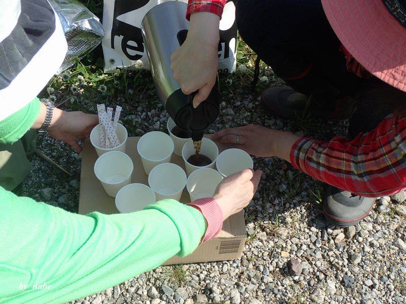 メインのひとつ、タンポポコーヒーを頂きます。長靴を履いた方には、枯れオギの藪こぎツアーが待っています。オギの芽をなるべく踏まないように、服装のチェックの後で入りましょう!