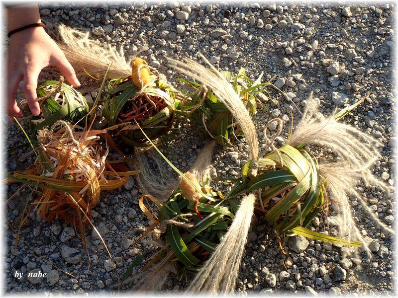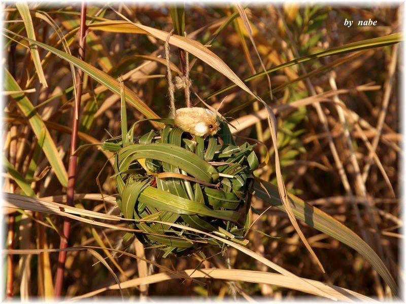 | 皆さん、カヤネズミの気持ちになって、思い思いに取り組まれていましたが、これが大変!本物は、約2時間で球巣を完成させますが、人間はやっぱり、カヤネズミにかないません。 | 完成した球巣に、実物大のカヤぐるみをのせてみました!いい感じでしょう? |