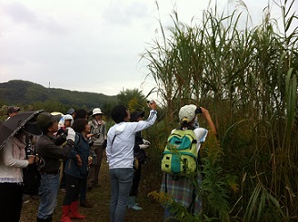 大人の背をはるかに超える高さのオギに巣を見つけて、みんなびっくり。カヤネズミを驚かさないように、静かに観察しました。湿地が乾燥して、外来種のセイタカアワダチソウが増えてしまった場所なども見学して、カヤネズミがくらす場所を守るにはどうしたらいいか、みんなで考えました。→麻機遊水池自然再生協議会(カヤネズミ学習会を開催しました)